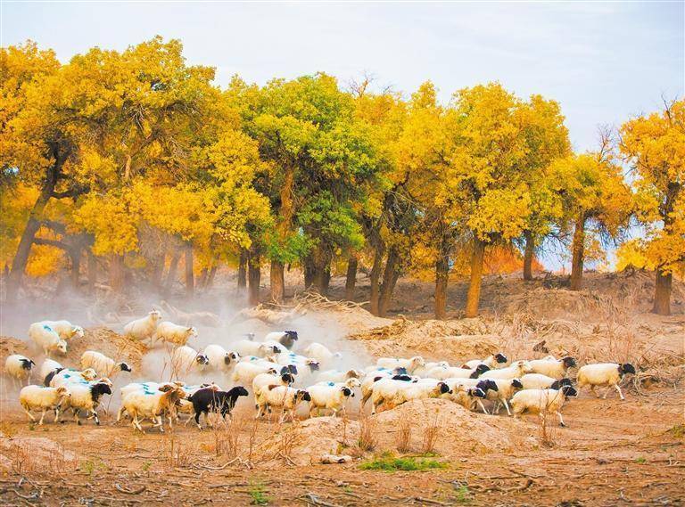 10月13日,内蒙古自治区阿拉善盟额济纳旗达来呼布镇,羊群在胡杨林中觅食。